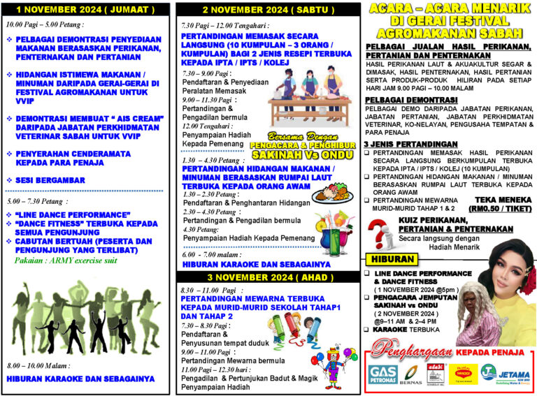 FESTIVAL AGROMAKANAN SABAH SEMPENA HPPNS 2024 (1-3 NOVEMBER 2024) 29/10/2024 Off By Web Master PERTANDINGAN MEWARNA SEMPENA HPPNS 2024 (1-3 NOVEMBER 2024) NOTIS TARIKH AKHIR PENGHANTARAN BIL/TUNTUTAN KE CAWANGAN AKAUN