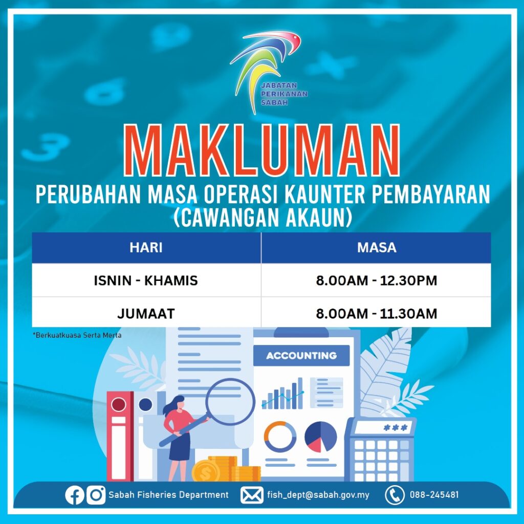 Makluman Umum Waktu Operasi Kaunter Hasil (Cawangan Akaun) Jabatan Perikanan Sabah adalah seperti berikut Hari Waktu Operasi ISNIN – KHAMIS